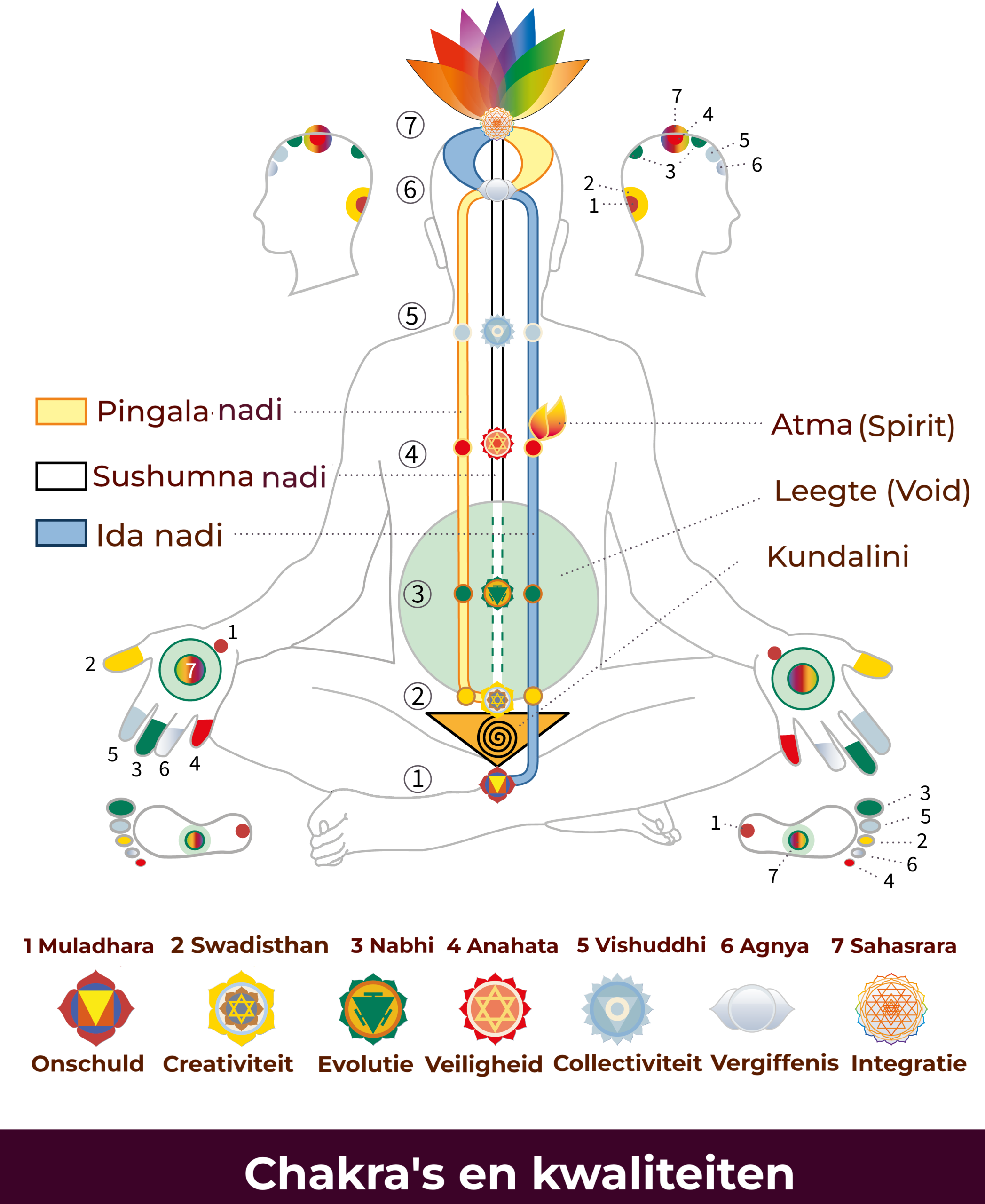 Er is een één-op-één correlatie tussen de chakra's in het ruggenmerg en de corresponderende uiteinden op onze handen en voeten. Als je de juiste ontcijfering kent van deze locaties in ons lichaam en hun corresponderende subtiele centra (chakra's) wordt je gemakkelijk meester over je fysieke, mentale, emotionele en spirituele wezen. Je bent niet langer afgescheiden van de absolute universele werkelijkheid, maar je kunt je door zelfkennis losmaken van de illusies van waargenomen werkelijkheden.